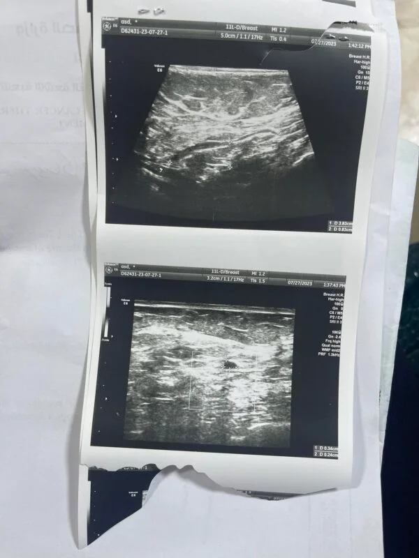تم اخذ المريضة الى الطبيب المختص واخبرنا ان هناك ورم بسيط في الثدي الاخر وان شاء الله يمكن ان يختفي بالعلاج لكن يجب ان تستمر على العلاج دون انقطاع نهائيا لضمان عدم رجوع المرض او انتشاره في اماكن اخرى. وبحمد الله وفضله تم تأمين وتسليم المريضة الدواء الذي تحتاجه لمدة شهر.